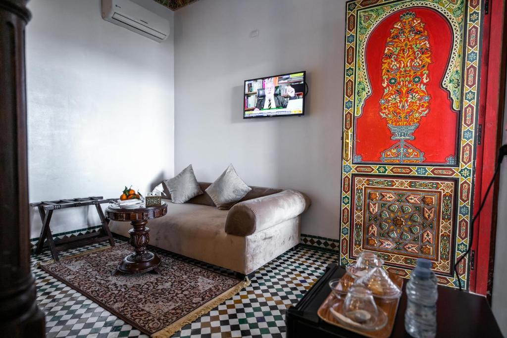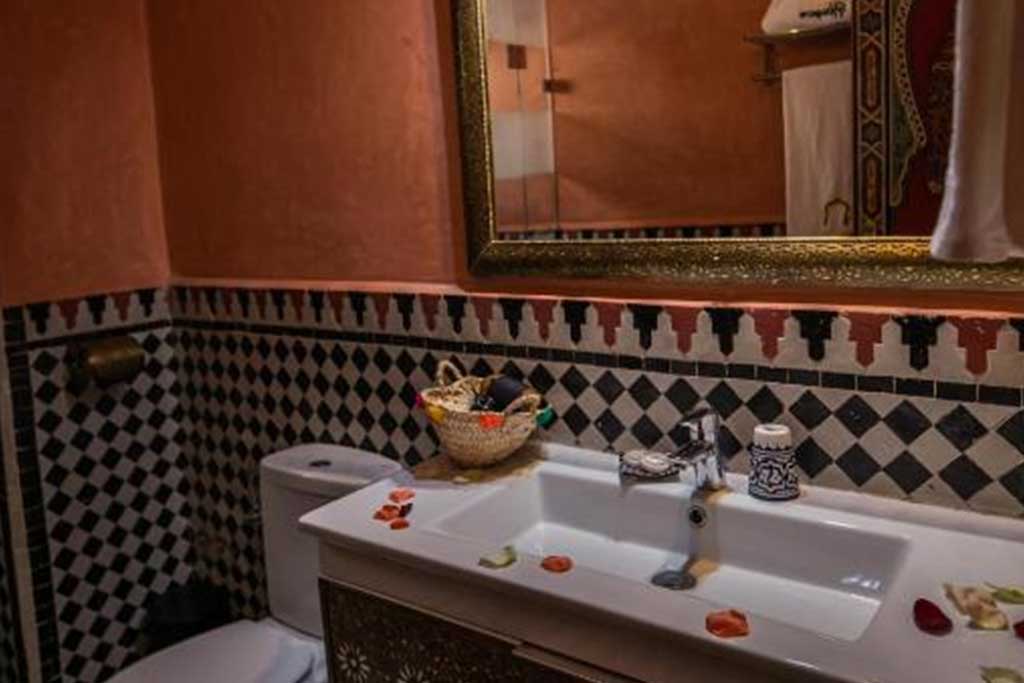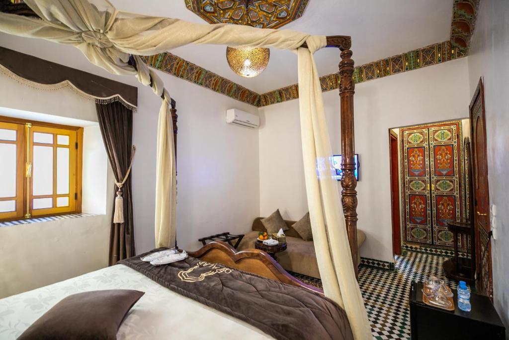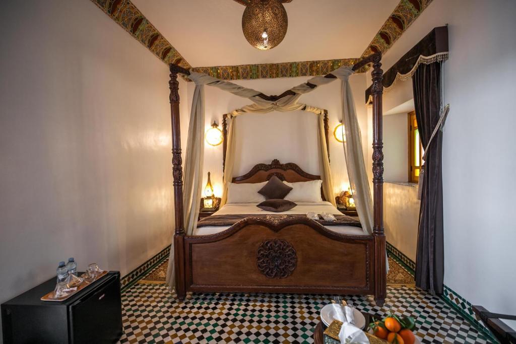 The deluxe double room at Palais Houyam is one of the classic options that you can go for when staying here. This soundproofed 18 meters square room comes with a large double bed lined in traditional Moroccan bedding. This double room has a flat-screen TV, soundproofing and a Zellige tile floor. Enjoy the authentic Moroccan experience with the room’s ambiance and décor, which is all sourced locally from traditional artisans in Fes.