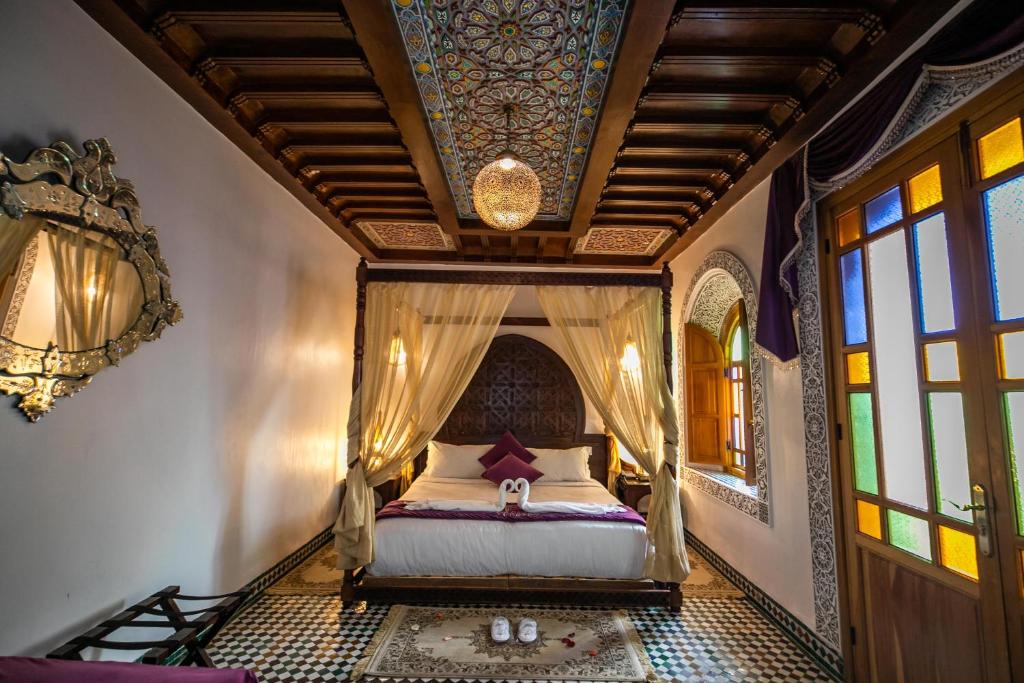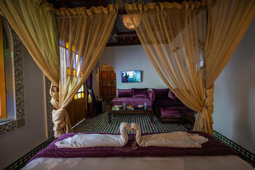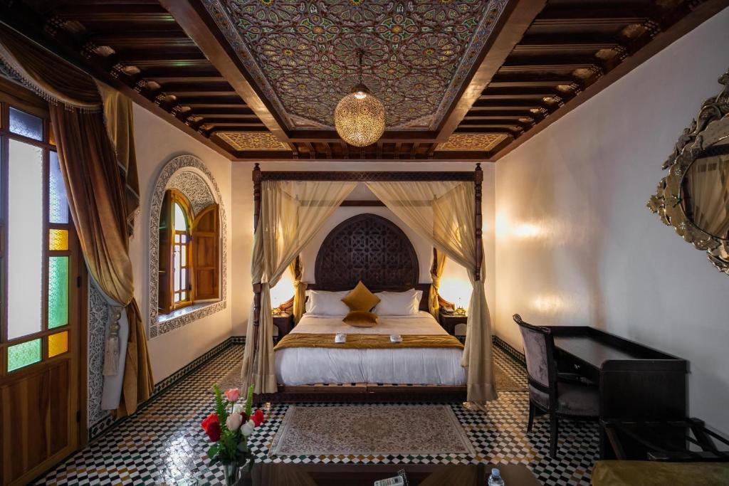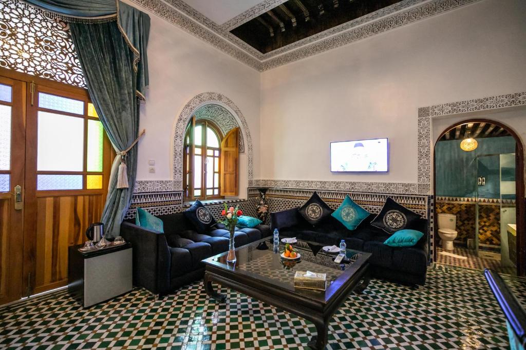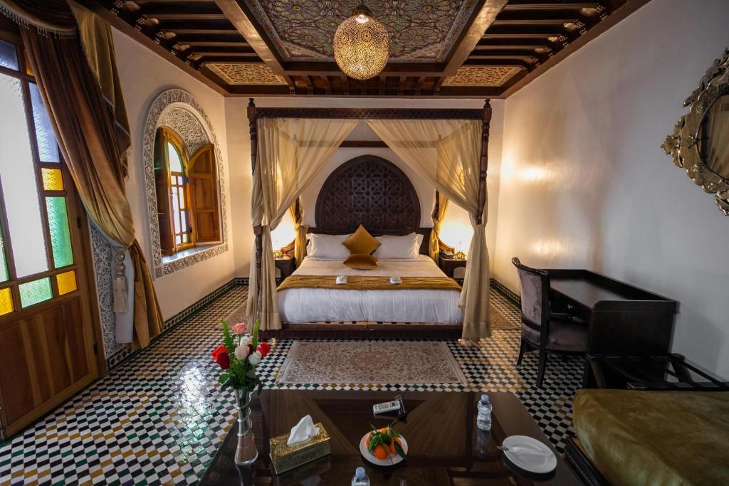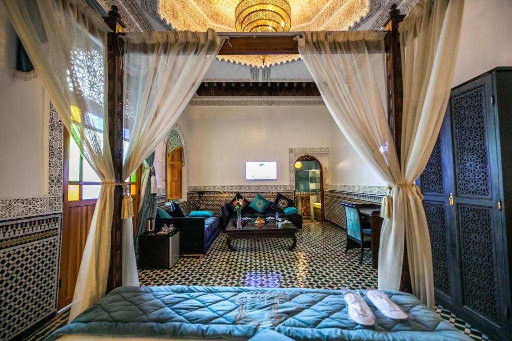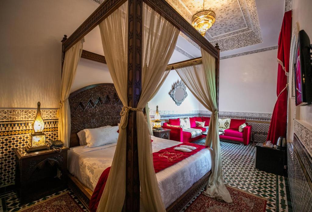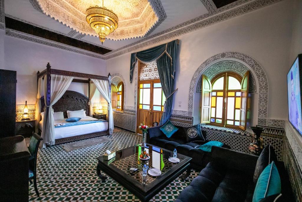 The famous Royal Suite at Palais Houyam is a perfect options that offers you a luxurious Moroccan experience. This soundproofed 35 meters square room comes with an extra-large double bed and Sofa all lined in traditional Moroccan bedding. This Royal suite has a flat-screen TV, soundproofing and a Zellige tile floor. Enjoy the authentic Moroccan experience with the room’s ambiance and décor, which is all sourced locally from traditional artisans in Fes.
