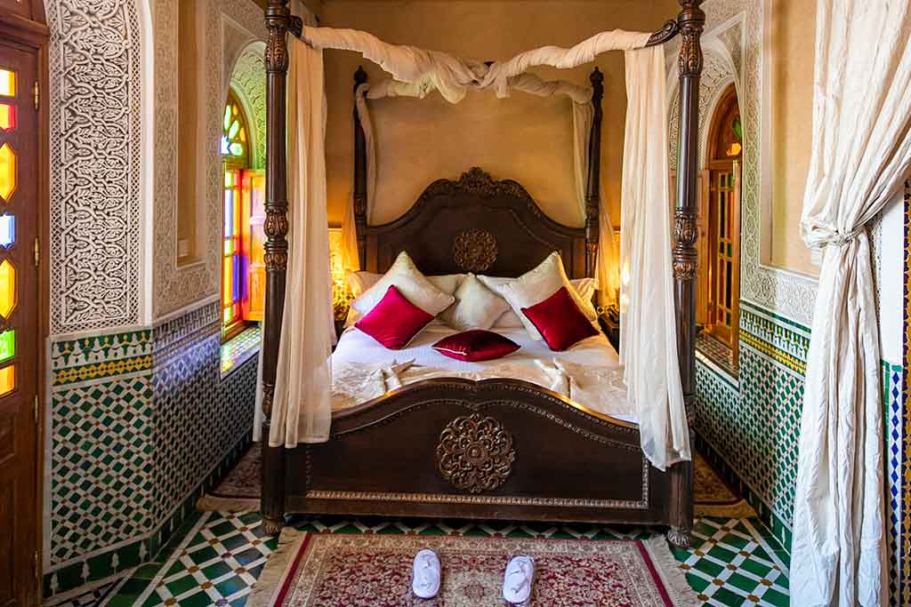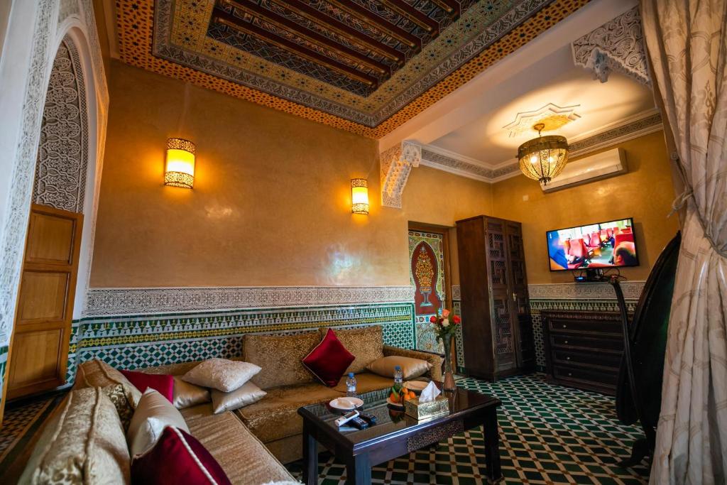 One of the most popular suites amongst Palais Houyam’s guests is the Premium Suite. This 26 square meter suite can accommodate up to 3 people with its extra-large bed and large sofa, all lined in traditional Moroccan bedding. This Premium Suite has a flat-screen TV, soundproofing and Zellige tile covered flooring and walls. Enjoy the authentic Moroccan experience with the suite’s ambiance and décor, which is all sourced locally from traditional artisans in Fes.