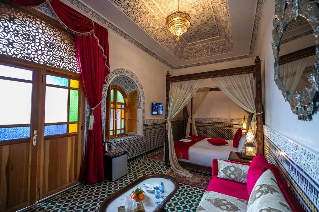 The famous Royal Suite at Palais Houyam is a perfect options that offers you a luxurious Moroccan experience. This soundproofed 35 meters square room comes with an extra-large double bed and Sofa all lined in traditional Moroccan bedding. This Royal suite has a flat-screen TV, soundproofing and a Zellige tile floor. Enjoy the authentic Moroccan experience with the room’s ambiance and décor, which is all sourced locally from traditional artisans in Fes.